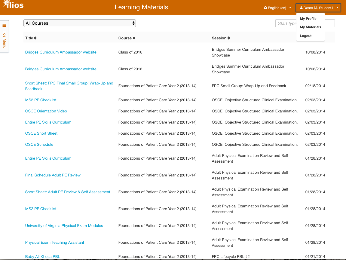 A: Beginning with our latest release, v3.22.0, you can. Along with the new course-based Learning Materials Summary page (accessible by course administrators from every course management page starting with v3.21.0), every user now has access to their entire history of digital assets from Ilios, available from the “My Materials” link in the identity/login dropdown at the upper right of the Ilios window.